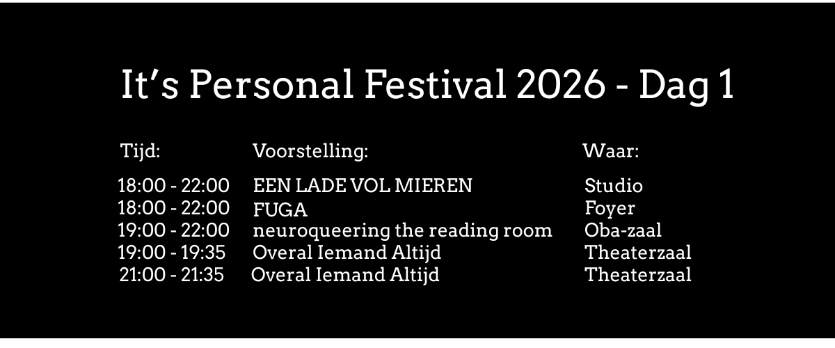 Je bent nu op de pagina van It's Personal Festival 2026 - DAG 1. Je kunt hier (rechts) kaartjes kopen voor twee opvoeringen, ééntje om 19.00u en ééntje om 21.00u. Je kunt hiermee naar de voorstelling Altijd Iemand Overal om de door jou gekozen tijd. Máár, dat kaartje geldt ook als kaartje voor de héle festivaldag. Kom dus vooral alles ontdekken wat zich vandaag afspeelt!
