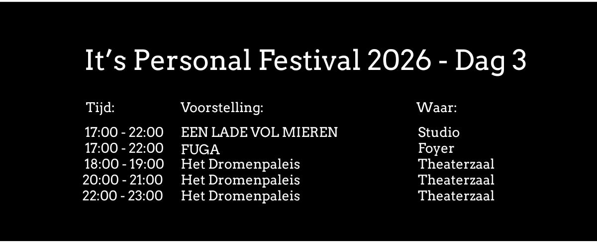 Je bent nu op de pagina van It's Personal Festival 2026 - DAG 3. Je kunt hier (rechts) kaartjes kopen voor drie opvoering. Er zijn drie verschillende startmomenten voor de installatie 'Het Dromenpaleis'. Goed nieuws: met je kaartje voor één van die momenten ben je de hele dag welkom op het festival. Kom dus vooral alles ontdekken wat zich vandaag afspeelt!
